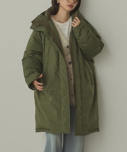 ◾デザイン 大きめフードや袖口リブを使用し、防寒対策できるロングコート◎ 衿内側・ポケット・前立て内側にはフリースを使用し、あたたかく仕上げています。 ◾素材 細番手の目の詰まった素材で、キレイみえします。 保温機能のある、中綿(SORONA)を使用しています。 -特徴- ・保温性がある ・普通のポリエステル中綿に比べて2倍の柔らかさ ・かさ高性があり、ふわっとした手触り ・キックバックに優れ、元の形に戻りやすいので型崩れしにくい サイズ:FREE 身幅:69.5cm (半身にて計測) 着丈:98cm 裄丈:84.5cm ■生産地:中国 ■素材・成分:表地:ポリエステル100% 中わた:ポリエステル100% 裏地:ポリエステル100% リブ:ポリエステル98%,ポリウレタン2%