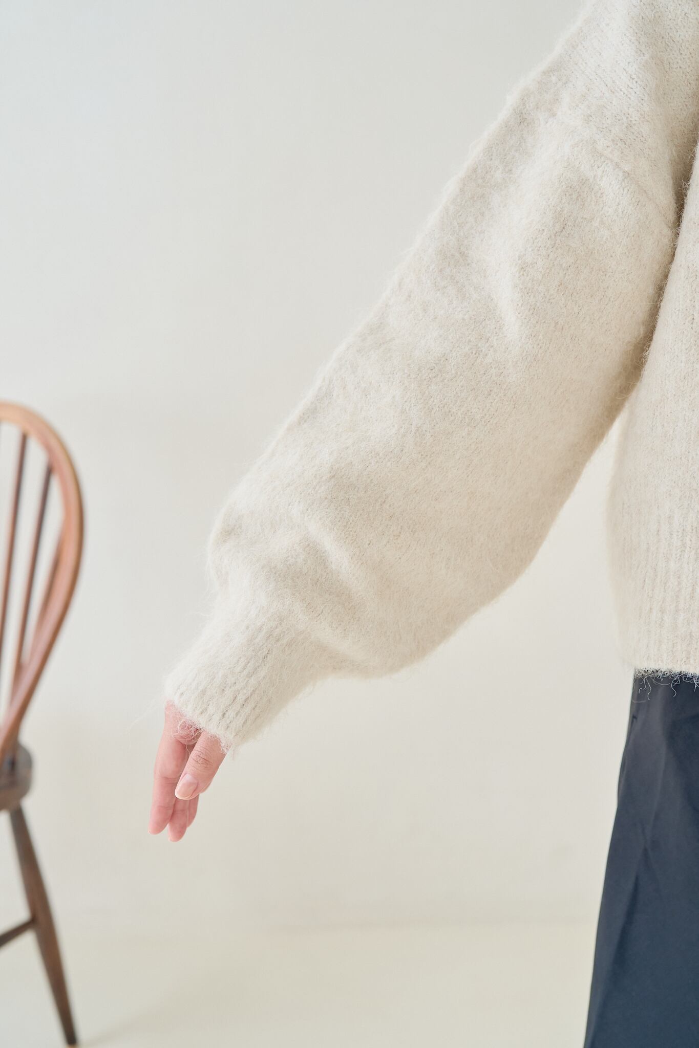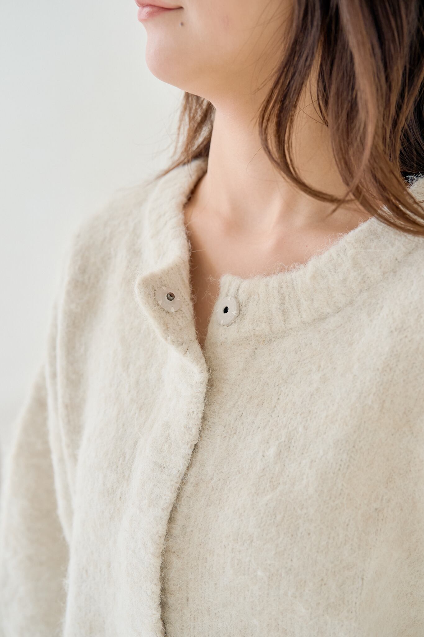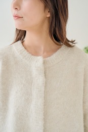 柔らかな起毛が心地よく、ミックスヤーンのデザインが可愛らしさを演出するカーディガンです。フラッフィーな素材感が女性らしい雰囲気を引き立て、ワイドな巾と少し短めの丈感がトレンドライクなスタイルを実現します。