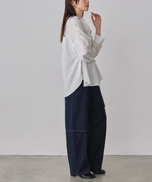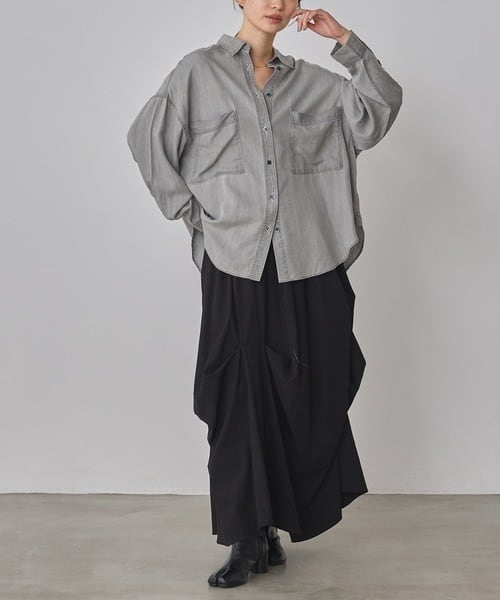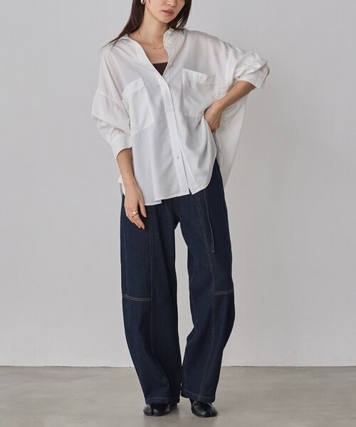 シルクのような自然な光沢感を持つテンセルデニムを使用。柔らかくしなやかな素材は、肌触りが良く、着心地も抜群です。また、通気性にも優れており、季節を問わず快適に着用できます。さらっとした質感が魅力で、着回しも容易です。